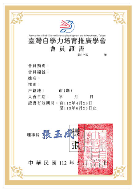 本會為因應會員需求,將提供會員申請「會員證書」(證書樣式如下圖所示),如有欲申請者,請填寫下列申請表單 https://reurl.cc/r5dy8E ,本會將盡速寄發「會員證書」正本,謝謝。